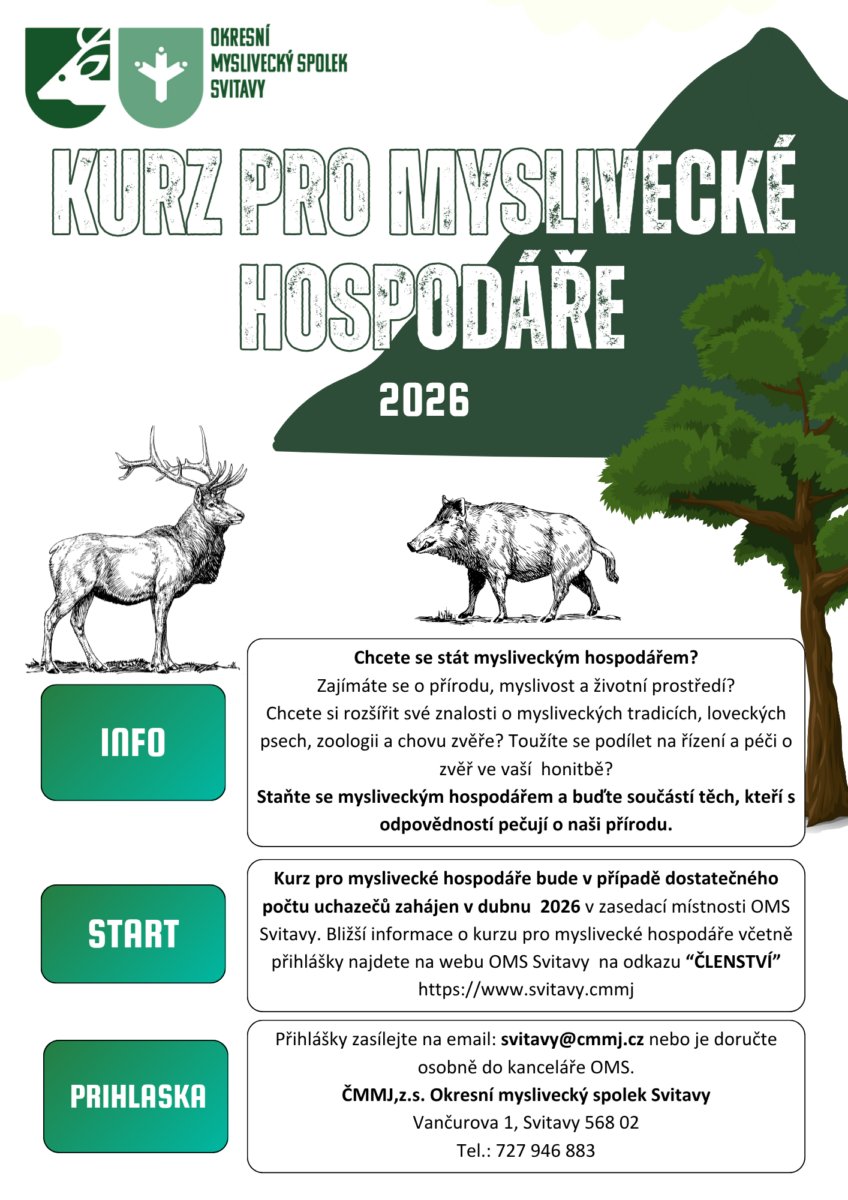 Kurz hospodářů bude probíhat v zasedací místnosti na OMS Svitavy a místo vykonání zkoušky bude upřesněno. Lektoři a zkušební komisaři budou jmenováni Okresní mysliveckou radou Svitavy.
